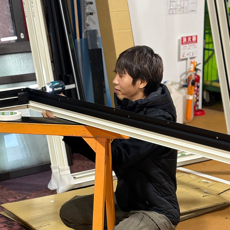 骨組みとガラスを組み合わせてサッシを組み立てたり、現場でサッシの取り付けをしたりしています。取り付けをしていて思うのは、窓が入ると建物として完成していくのが目に見えて分かるので、自分が貢献できていることにやりがいを感じます。